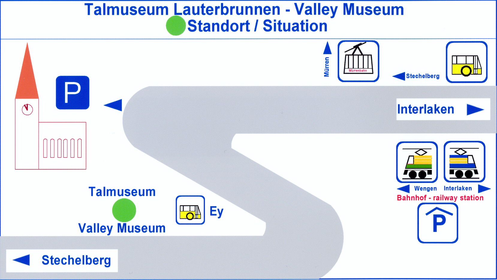 Anreise mit PW bis Parkhaus Lauterbrunnen. 10-Minuten-Spaziergang durch das Dorf Lauterbrunnen, entlang der Dorfstrasse via Kirche zum Museum. Oder 10-Minuten-Spaziergang via Dorfteil „Stocki“ zum Museum.